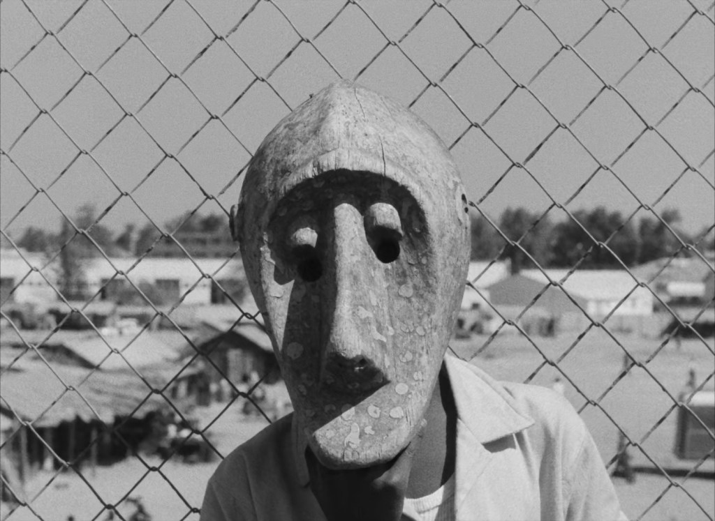 Throughout the movie there is one important motif, in form of a traditional African mask. This mask is bought by Diouana from a little boy in Senegal and later given as a present to Madame, for giving her the opportunity to work for her. Soon this mask is derived from all meaning and merely a souvenir hanging on the white wall in Antibes. As time passes and Diouana becomes more aware of her situation, this mask becomes a representation of her longings for home and old traditions. She tears the mask of the wall in the final act, and says that the mask doesn’t belong to them. She commits suicide. Monsieur decides to take her belonging and the mask back to Senegal, to give it to her mother. Monsieur tries to give the mother also the money belonging to Diouana, but knowing it’s dirty, she doesn’t accept it. The mask is picked up by a little boy and he chases Monsieur out of the village, while holding the mask in front of his face. Symbolizing the past of Africa haunting its colonizers. Traditional mask often symbolized the dead ancestors. This mask also symbolized Diouana’s homecoming. Although not physically, her spirit did make it back to Senegal.