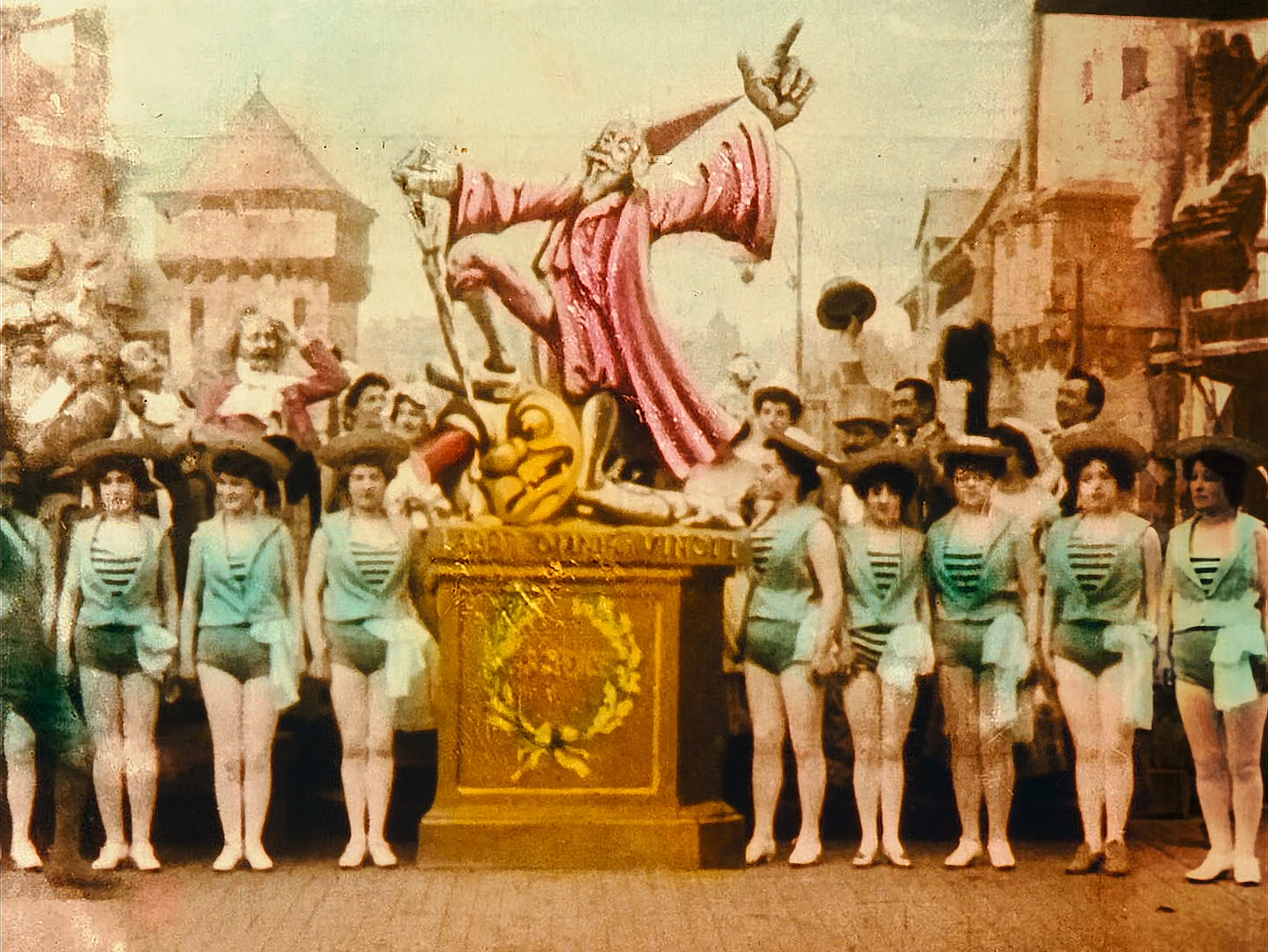They manage to escape because one the astronauts picks up the king, who changes into a doll by the use of special effects, and throws him to the ground. The astronauts run back to the spaceship while being pursued by a horde of Selenites. They manage to get inside the space ship, expect for Barbenfouillis, who jumps on a rope attached to the spaceship causing it to tip over the edge of a cliff. One Selenite jumps on the back of the spaceship and holds on. The spaceship falls back to earth and lands in the ocean. There is a big parade upon their return home. All the astronauts are getting a medal for their expedition and the Selenite, who held on to the spaceship, is imprisoned. The last shot is of a statue that is build to honor the astronauts, it displays the Latin phrase “Labor omnia vincit” meaning “Work conquers all”.