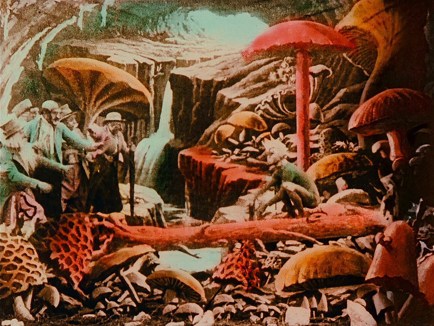 After landing on the moon, the crew decides to sleep. They get visited by multiple stars with human faces, Saturn and Phoebe. Phoebe was the one of the titans in Greek mythology, grandmother of Apollo, the god of the Sun and Artemis, goddess of the moon. Phoebe is also one of the moons of Saturn, discovered in 1899. Phoebe makes it snow and the astronauts wake up. They run into a cave to seek shelter. Here they have the first encounter with a hostile Selenite, an inhabitant of the moon, luckily he is easily killed and goes up in smoke. But soon more Selenites rush from the right side of the screen after them, the astronauts get captured and taken to their king.